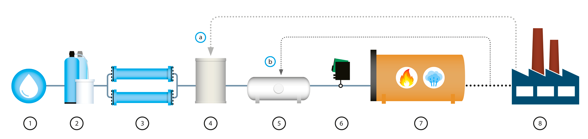 Kondenzovaná voda jde do vodní nádrže (a). Pára pro předehřev je vedena do termického odplyňovače (b).