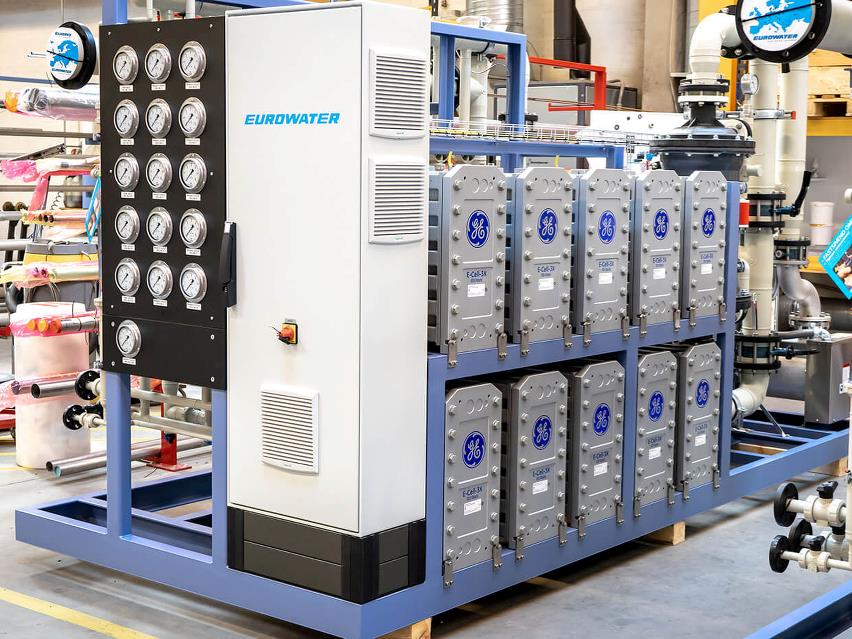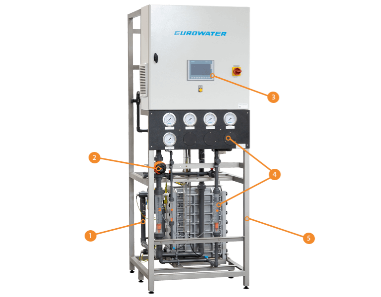 Die SPS ist in einem Schaltschrank mit Touchscreen-Bedienoberfläche installiert. Es lassen sich verschiedene Alarme einstellen: zu hohe Leitfähigkeit, zu geringer Produkt-, Konzentrat- und Elektrodenfluss. Die Programmierung erfolgt durch EUROWATER-Automatisierungsingenieure, wodurch Sie eine flexible Software erhalten, die auf Ihren Betrieb zugeschnitten ist.