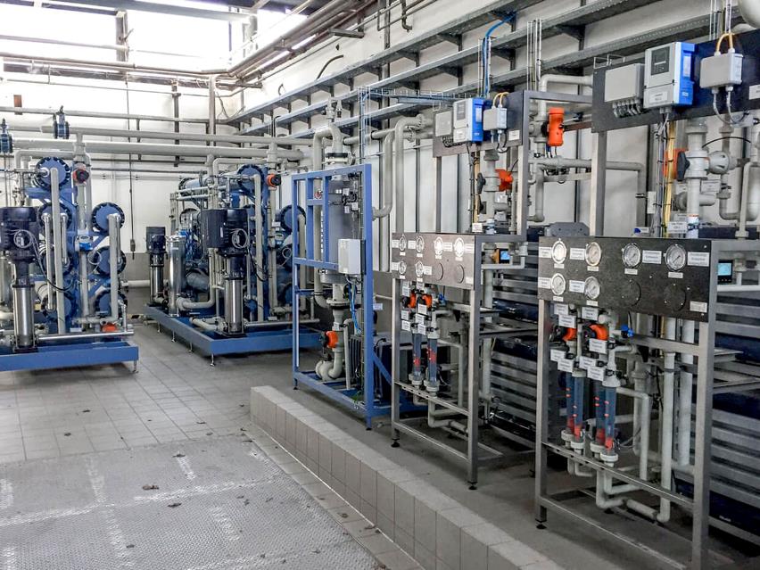 EDI nach einer Umkehrosmose liefert hochreines Prozesswasser mit geringer Leitfähigkeit. Das Bild zeigt eine EDI-Anlage für hochreines Wasser bei einem Unternehmen der Mikroelektronikbranche. Das EDI wird mit speziellen Pharmamodulen auf eine hygienische Ausführung angepasst.
