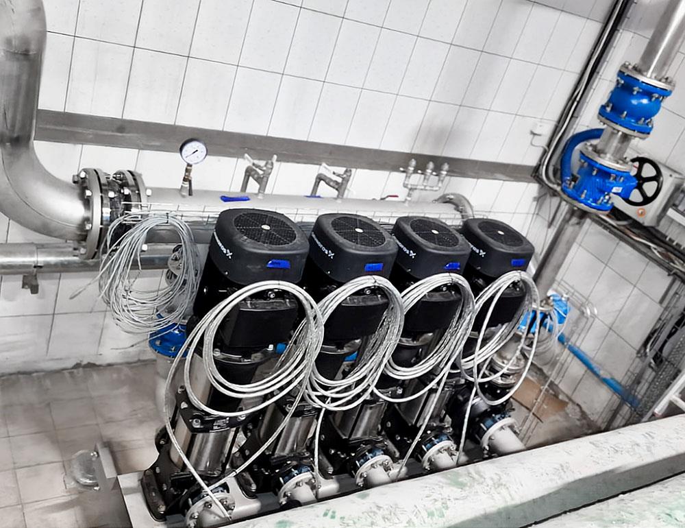 The treated water goes to two external storage tanks, each with a capacity of 400 m³. The water is then distributed to the different production zones by two booster systems based on Grundfos CR pumps.