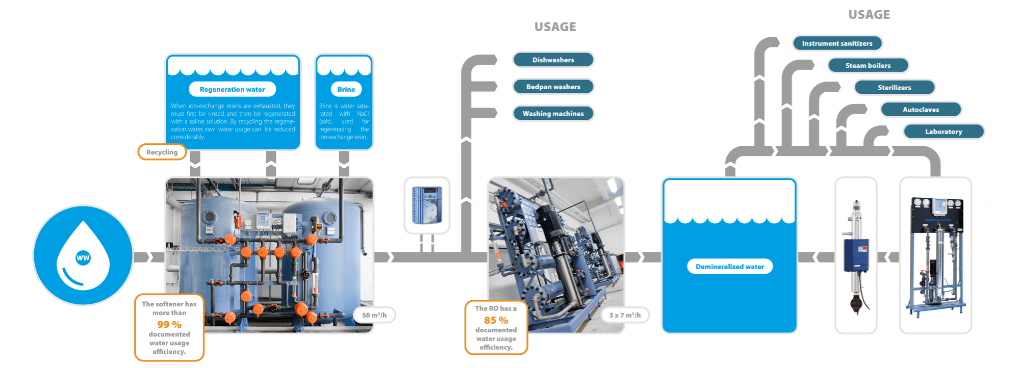 At the regional hospital in Viborg, Denmark two independent double-pass reverse osmosis (DPRO) units secure the production of demineralized water in the CSSD. DPRO function as a hygienic barrier in case of breakdown or when preventive maintenance is needed.