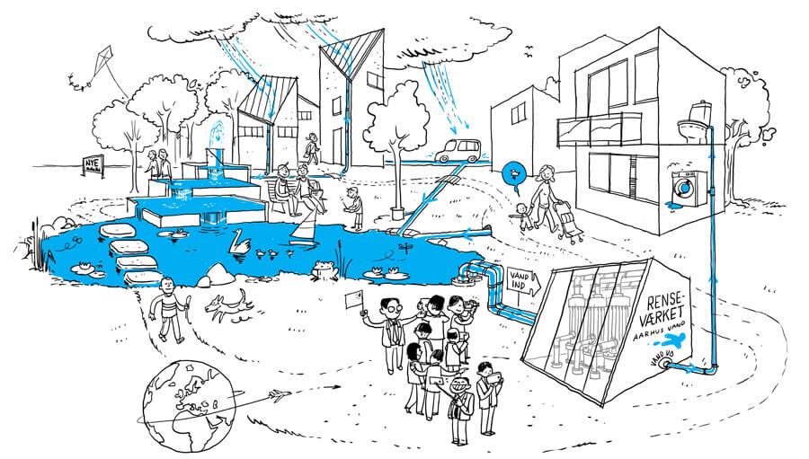 Aarhus, la deuxième plus grande ville du Danemark, a une nouvelle banlieue appelée NYE («nouvelle»). La création d'une nouvelle banlieue offre la possibilité de repenser les ressources et de développer une ville habitable intelligente avec une approche holistique de la gestion des ressources en eau.