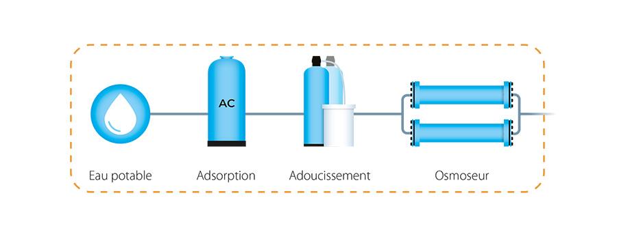 Adoucissement pour éliminer la dureté afin d'éviter l'entartrage de la membrane. - 99 % d'élimination des matières inorganiques et des micro-organismes