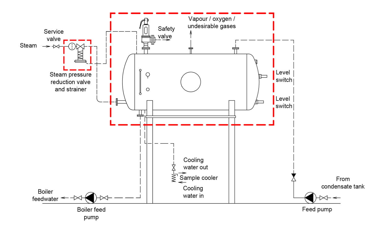 Betrouwbare en efficiënte ontgasser geschikt voor stoomketels geleverd compleet met fittingen, d.w.z. stoomdrukreduceerventiel, overdrukventiel, niveauregeling, waterniveau-indicator, thermometer en manometer.