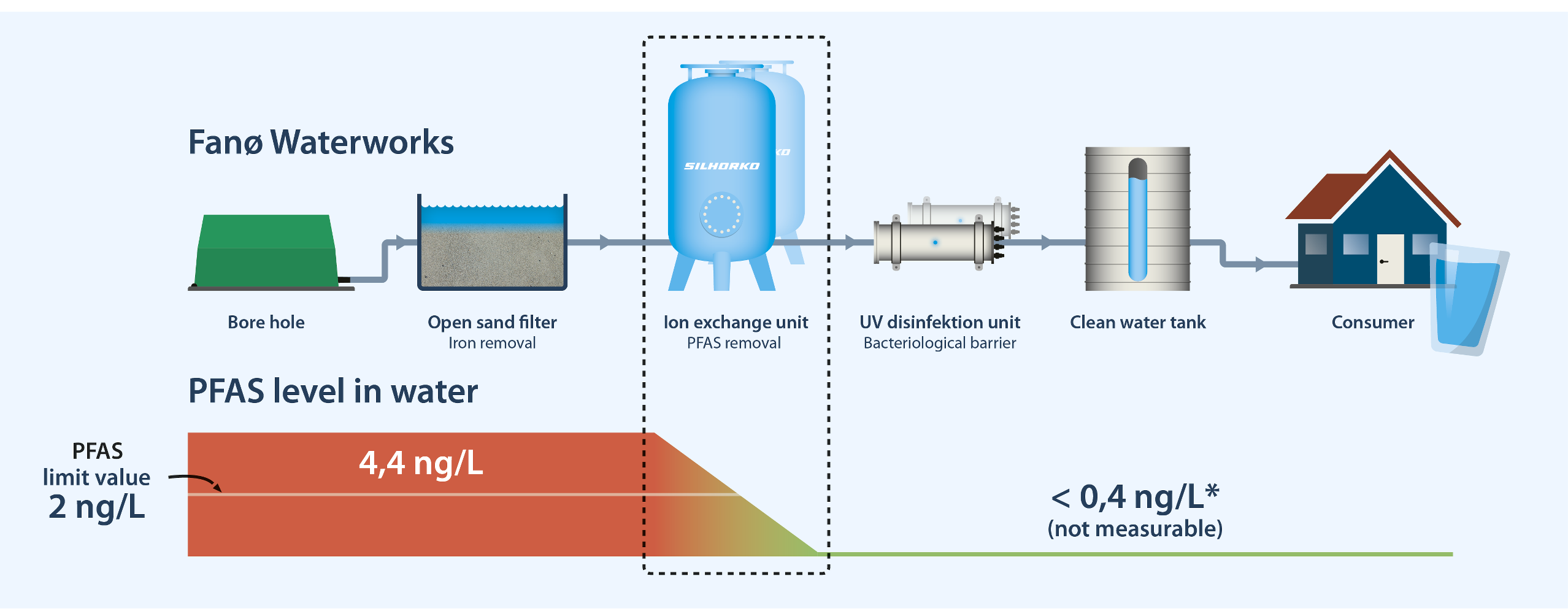 Grafikk viser veien til det PFAS-forurensede vannet fra borehull til kran på Fanø, etter at det nye ionebyttersystemet fra EUROWATER er installert.