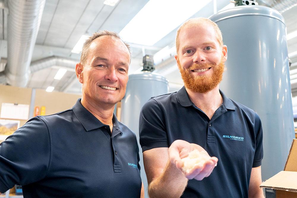 EUROWATERs avdelingsleder for drikkevann, Arne Koch (venstre), og kjemiingeniør og produktspesialist innen ionebytterteknologi, Søren Duch-Hennings (høyre), er de to nøkkelpersonene i utviklingen av det innovative anlegget. Her viser Søren hvilken type ionebyttere som brukes i anlegget.