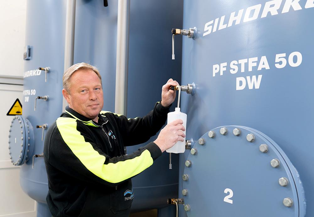 Jan Pedersen, driftsleder ved Fanø vannverk, tar en vannprøve fra ionebytter anlegget.