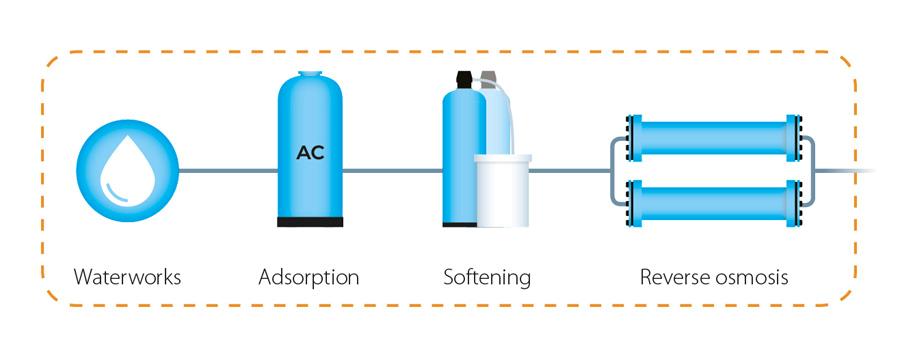 Adsorption genom tryckfilter eller aktivt kolfilter för avlägsnande av utfällning, suspenderade ämnen och fritt klor. - Avlägsnande av hårdhet