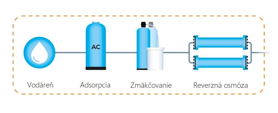 Jednotka reverznej osmózy vyrába demineralizovanú vodu s vodivosťou 10 až 15 μS/cm.